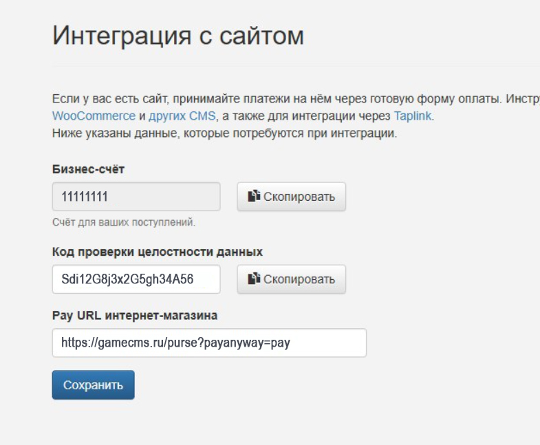 3. В настройках интеграции сайта заполняем Pay URL, его можно скопировать из блока "PayAnyWay" в админ центре в настройках платежных систем. "Бизнес-счет", "Код проверки целостности данных" вводим в соответствующие поля в блоке настроек PayAnyWay в движке.